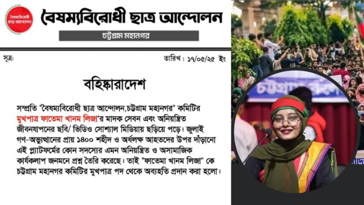 ‘বৈষম্যবিরোধী ছাত্র আন্দোলন, চট্টগ্রাম মহানগর’ কমিটির মুখপাত্র ফাতেমা খানম লিজাকে সংগঠন থেকে বহিষ্কার করা হয়েছে। সংগঠন সূত্রে জানা গেছে, ফাতেমার বিরুদ্ধে মাদক সেবন এবং অনিয়ন্ত্রিত জীবনযাপনের অভিযোগ উঠেছে, যার প্রমাণস্বরূপ কিছু ছবি ও ভিডিও সামাজিক যোগাযোগমাধ্যমে ছড়িয়ে পড়ে।